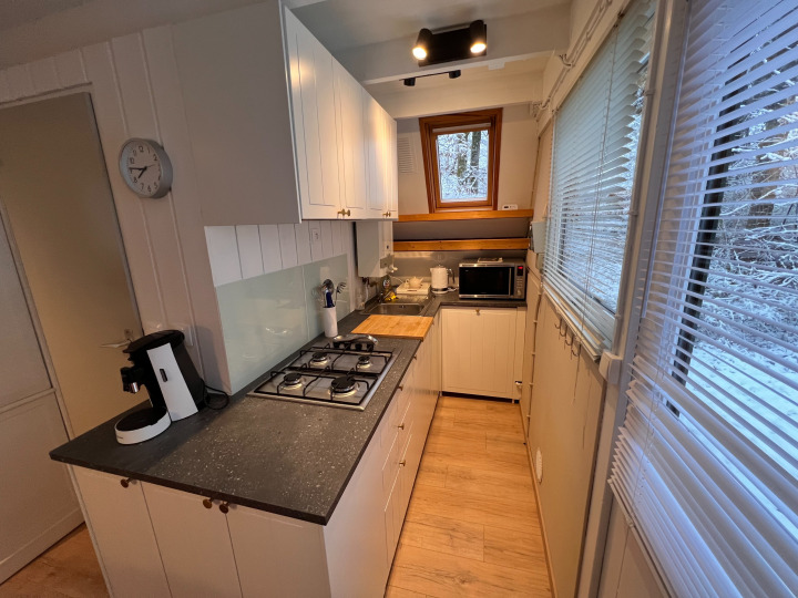 La cuisine est équipée d'un frigo avec petit congélateur, d'un lave-vaisselle, un four avec option micro-onde, d'un grille-pain, d'un bouilloire électrique, une machine à café traditionnelle et d'une senseo et de divers accessoires à patisserie